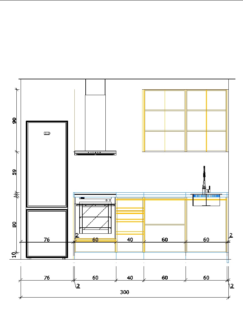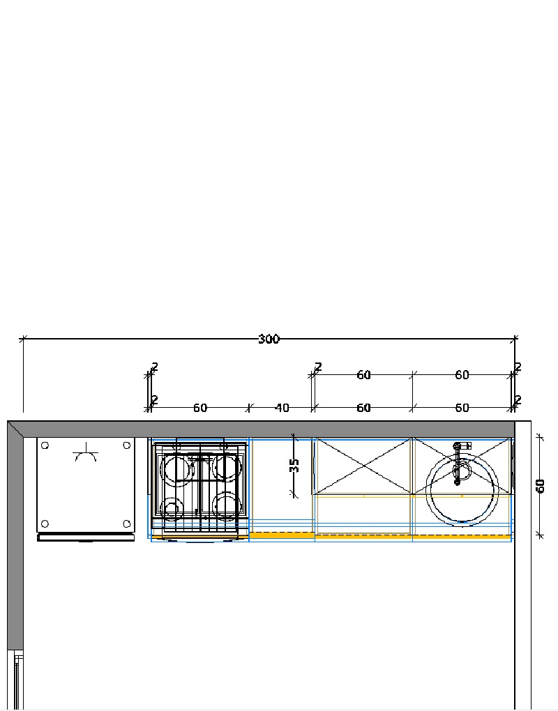 . 1 Mueble bajo fregadero 80 h x 60 p x 60 a cms. 1 puerta + 1 Mueble horno vitro con un cajón 80 h x 60 p x 60 a cms. + 1 Cajonera 80 h x 60 p x 40 a cms. 2 cajones y un cacerolero + 1 Mueble 80 h x 60 p x 60 a. cms. 1 puerta + 2 Muebles altos 2 puertas de 90 h x 30 cms.