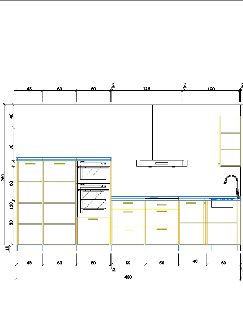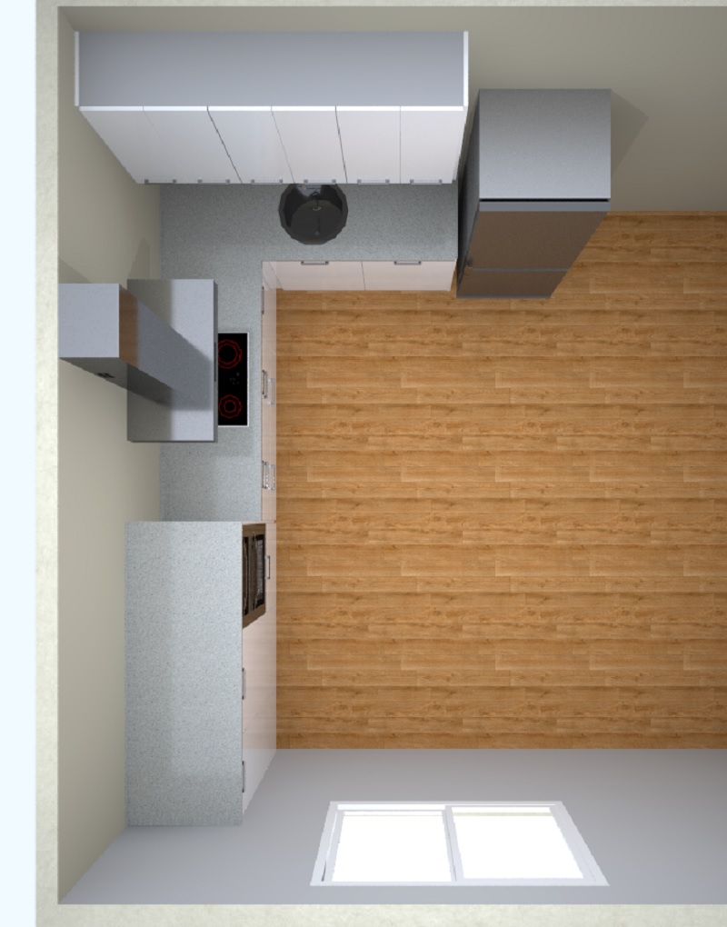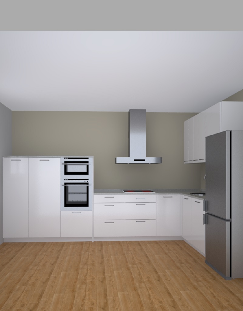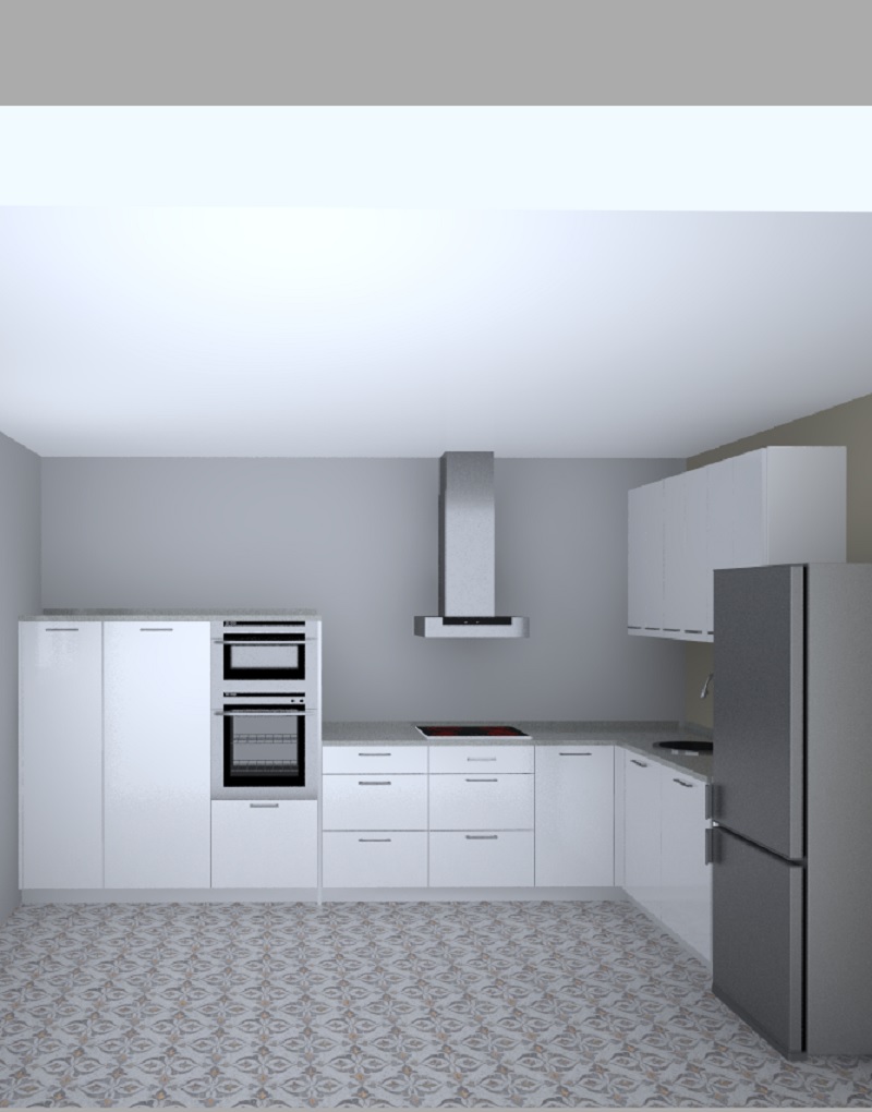 Una composición en L bastante completa. Zona de placa 394 de ancho con muebles semi columna despensa y horno microondas de 160 de altura y muebles bajos de 90 de altura con 4 caceroleros y 4 cajones. Zona de fregado 184 de ancho con muebles bajos, puertas. Muebles altos de 70 de altura, puertas. Encimera no incluida.