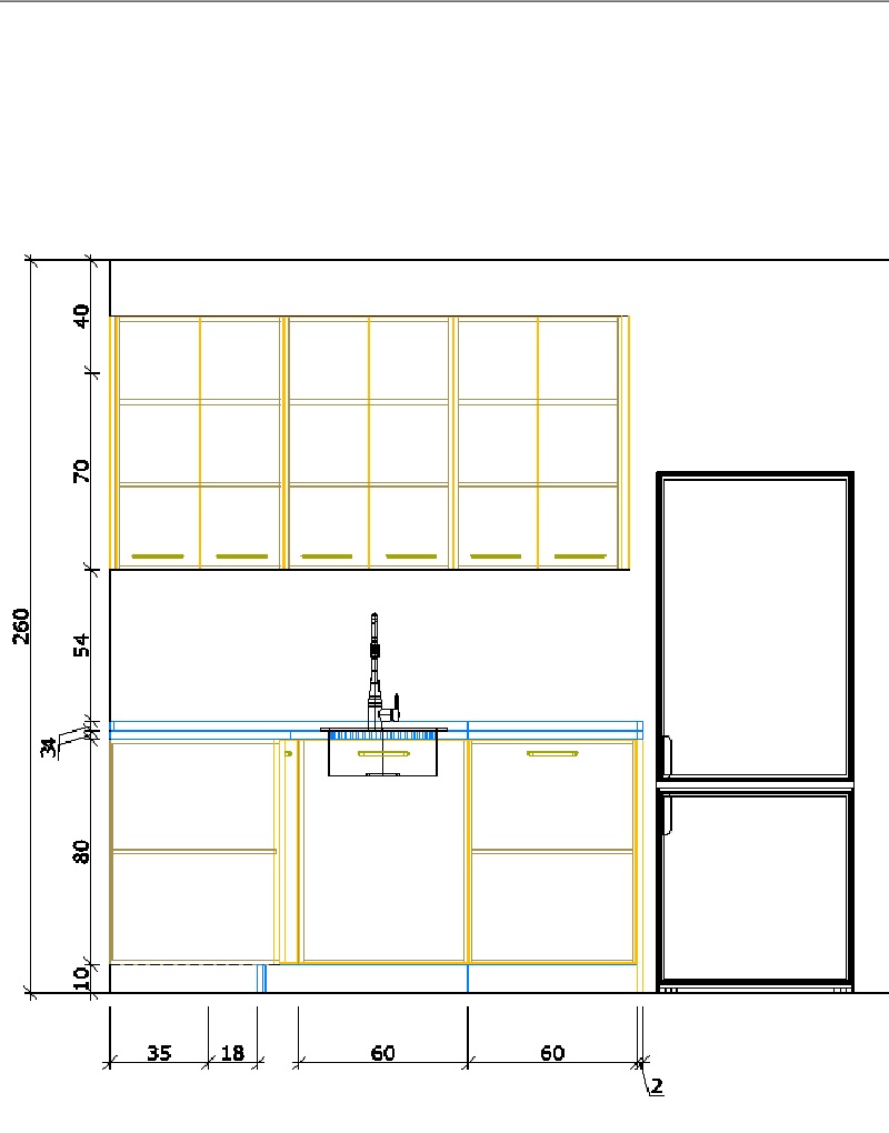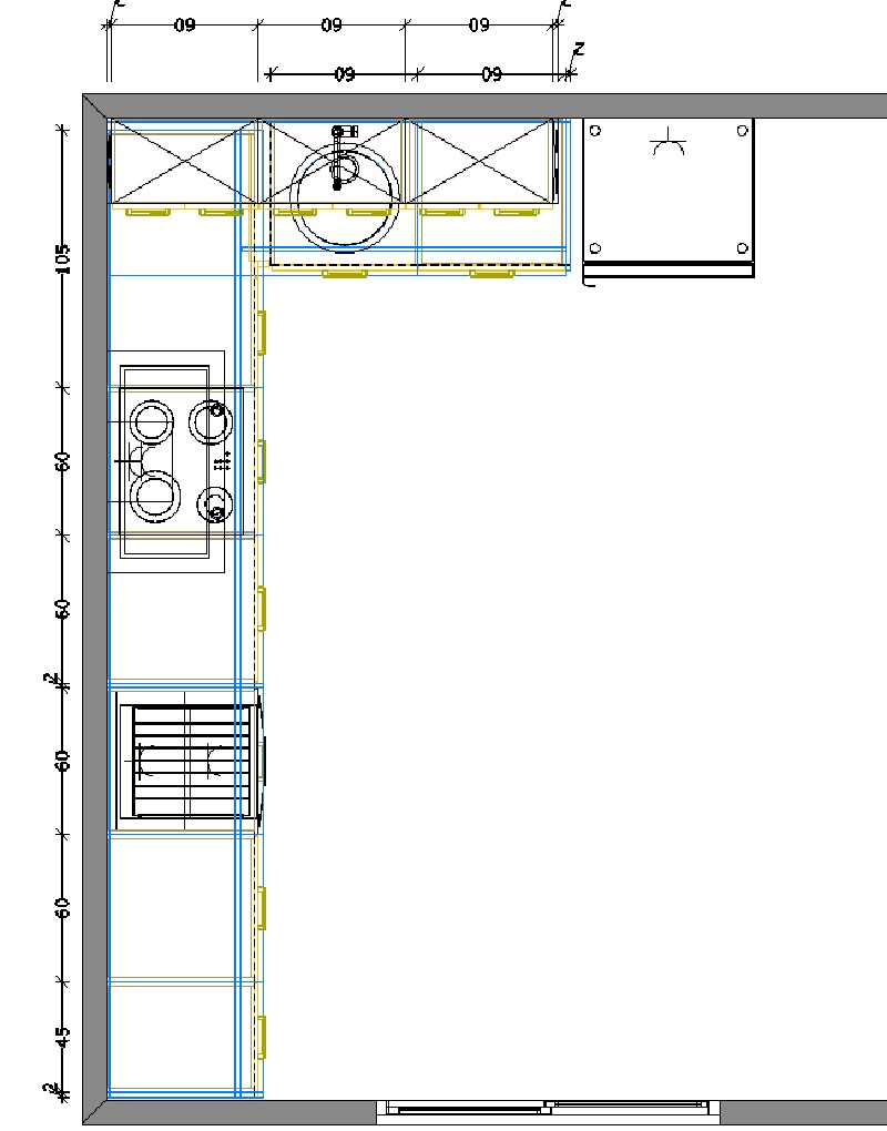 1 Mueble bajo fregadero 80 h x 60 f x 60 a cms. 1 puerta + 3 Muebles altos 70 h x 35 f x 60 a cms. 2 puertas + 1 Mueble bajo rincón ciego 80 h x 60 f x 100 a cms. 1 puerta + 2 Cajoneras 80 h x 60 f x 60 a cms. 2 caceroleros y 1 cajón + 1 Semi Columna Horno Micro 150 h x 60 f x 60 a cms. 1 puerta + 1 Semi columna despensa 150 h x 60 f x 60 a cms. 1 puerta + 1 Semi Columna 150 h x 60 f x 45 a cms. 1 puerta.