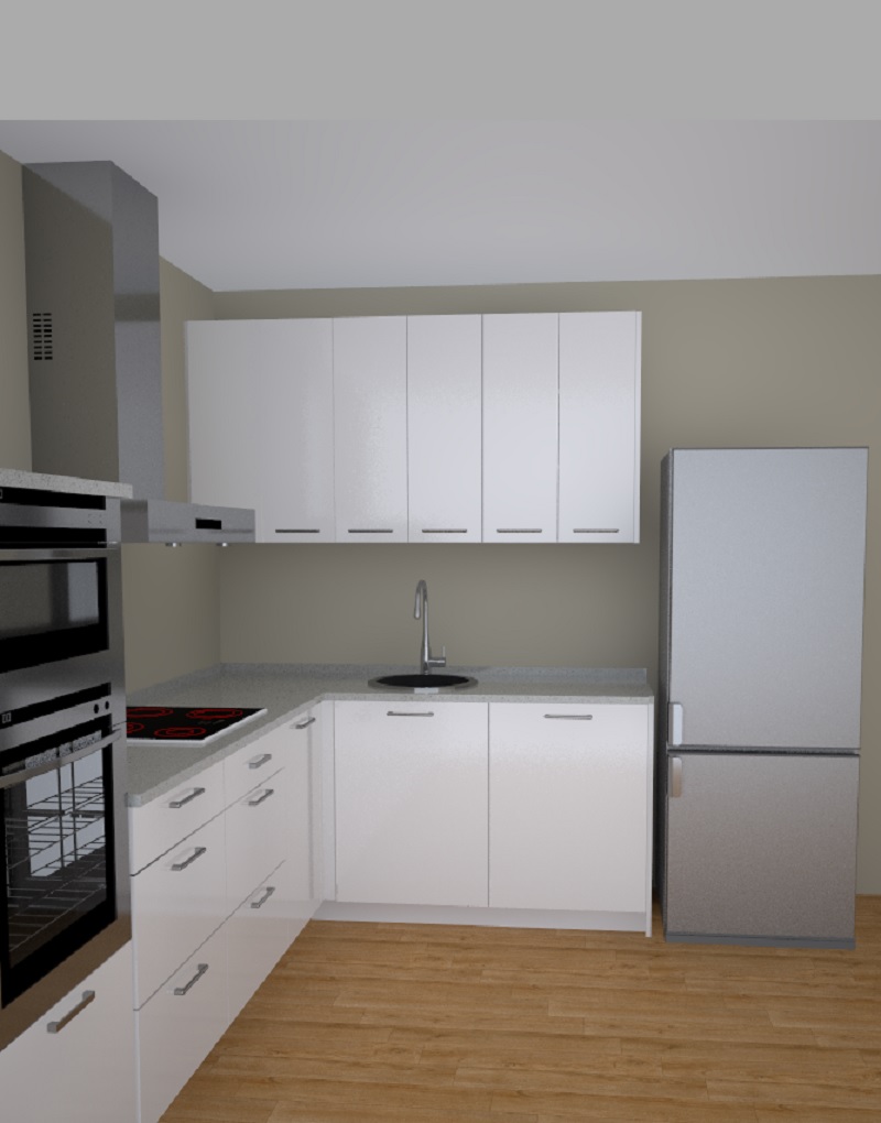 Colección BASIC, la más económica que tenemos. Podríamos abaratar más esta colección, pero entendemos que debe de tener lo básico para ser una gran cocina. Realizada en melamina decorativa acabada en mate, contracara similar acabado soft y canteada en ABS. Puertas y frentes de 22 mm. de grosor. Dispone de un amplio catálogo de terminaciones en madera que podrás combinar con el Blanco Polar de esta Colección para suavizar la fuerza de la madera o combinar con los colores lisos de nuestra Colección Urban. Con herraje tirador a elegir entre los 8 propuestos.