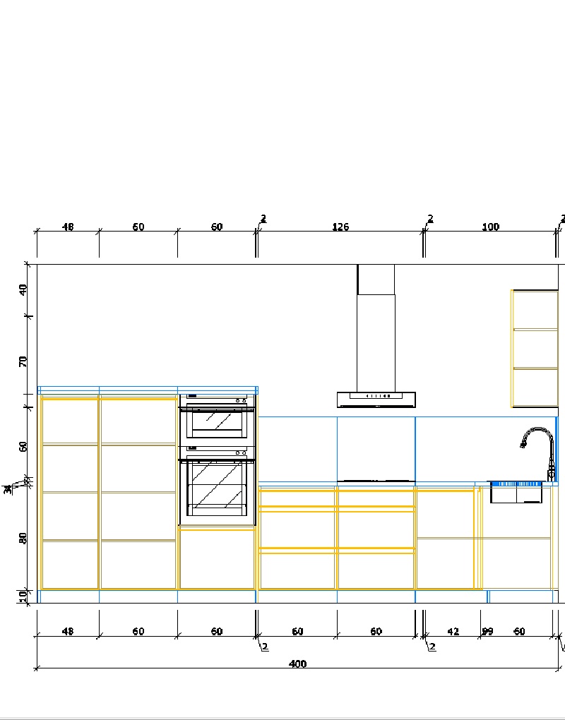Una composición en L bastante completa. Zona de placa 394 de ancho con muebles semi columna despensa y horno microondas de 160 de altura y muebles bajos de 90 de altura con caceroleros y cajones. Zona de fregado 184 de ancho con muebles bajos, puertas. Muebles altos de 70 de altura, puertas. Encimera no incluida.