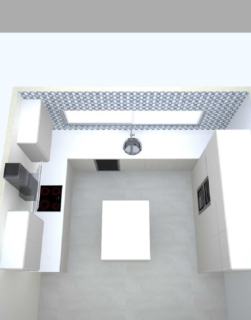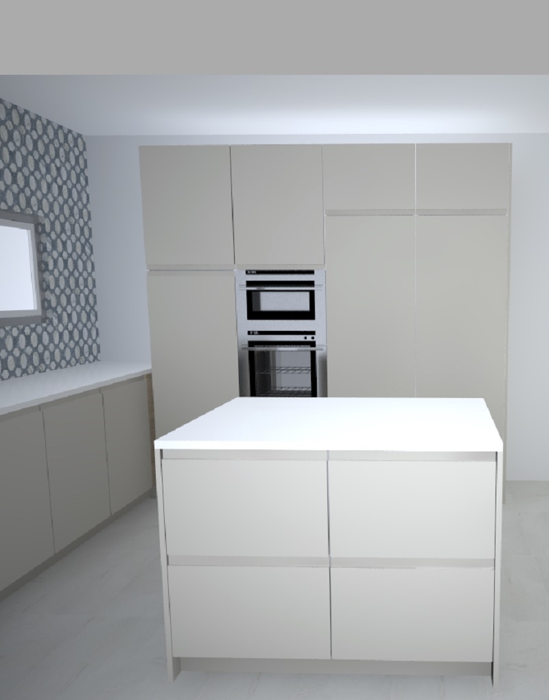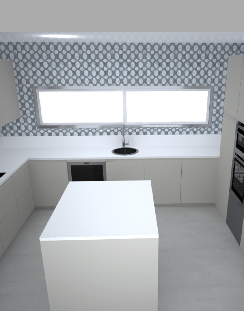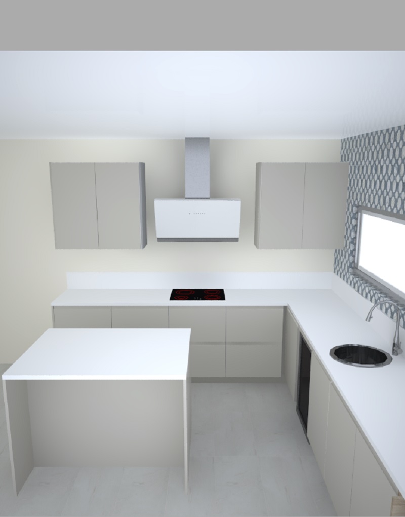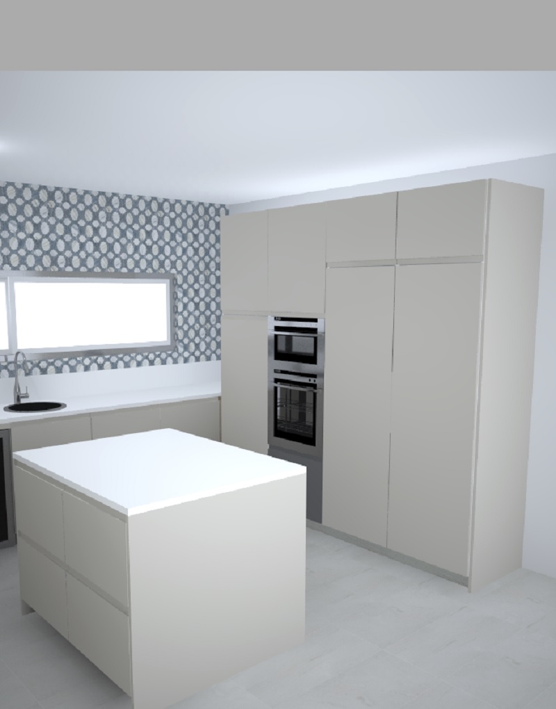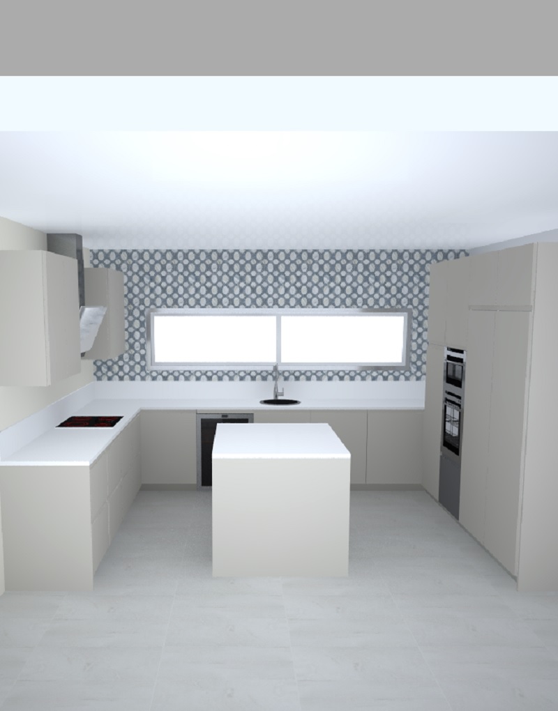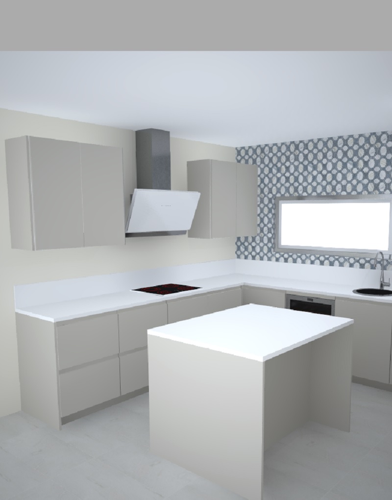 Composición en U con isla , una cocina grande para un espacio grande o diáfano. Ancho de 309 en la zona de cocción con muebles bajos de 90 de altura con 8 caceroleros y 1 cajón interior. Muebles altos de 90 de altura con puertas. Zona de fregado con un ancho de 420, muebles bajos con puertas y zona de columnas con un ancho de 309 con columnas despensa o para frigo integrado y columna horno microondas con puertas. Completa el diseño una isla de 94 de ancho por 90 de fondo. Encimera no incluida.