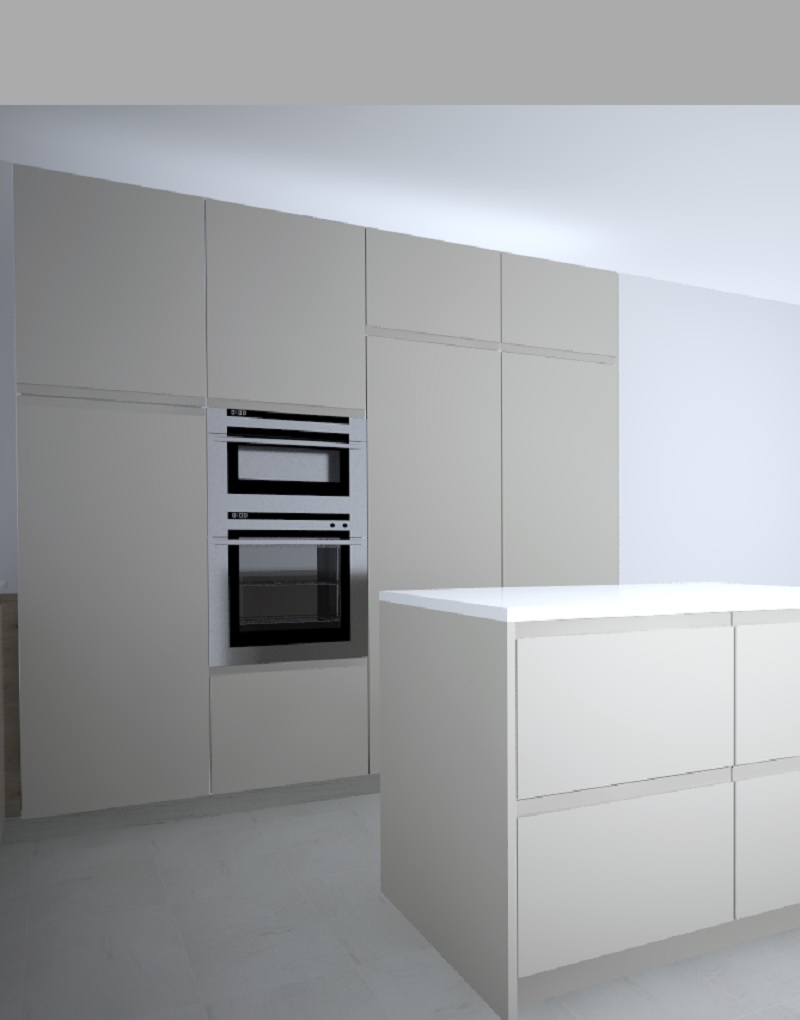 Con tirador uñero gola integrado en sus muebles bajos y con tirador integrado en U en los muebles de arriba, quedando oculto y proporcionando una visión muy limpia de los muebles.