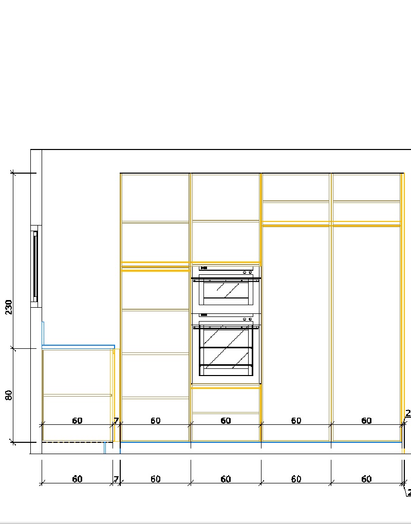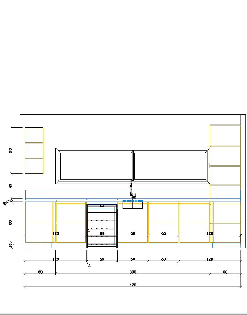 . 1 Mueble bajo fregadero 80 h x 60 p x 60 cms. 1 puerta + 1 Mueble bajo de 80 h x 60 f x 50 a cms. 1 puerta + 2 muebles bajo rincón ciego 80 h x 60 f x 120 a cms. 1 puerta + 1 hueco para vinoteca 90 h x 60 f x 60 a cms. + 6 Cajoneras 80 h x 60 p x 60 a cms. 2 caceroleros + 1 Cajón interior de 60 a cms. + 2 Mueble alto 70 h x 35 f x 90 a cms. 2 puertas + 1 Columna Despensa 230 h x 60 f x 60 a cms. 2 puertas + 1 Columna Horno Micro 230 h x 60 f x 60 a cms. 2 puertas + 2 Columna Frigo integrado 195 h x 60 f x 60 a cms. 1 puerta + 2 Altos ASF 45 h x 35 f x 60 a cms.
