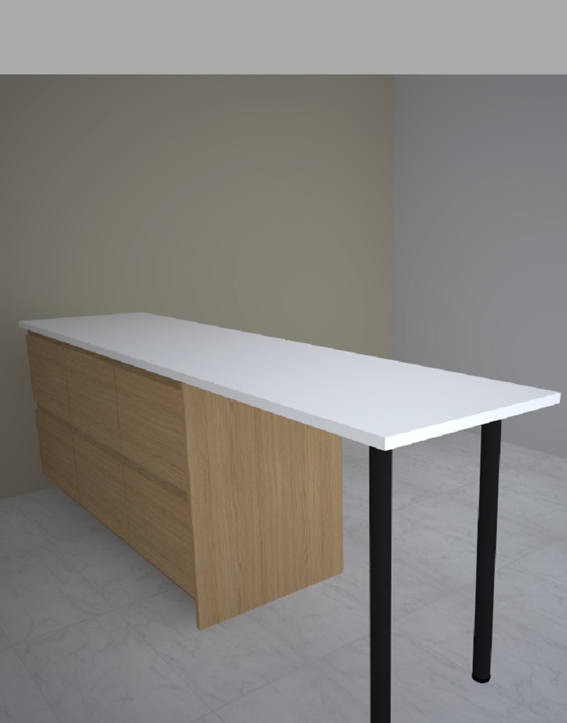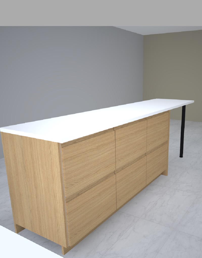 Una composición Isla o península con muebles de 90 de altura y fondo 63 ya que lleva un costado para la trasera y otro para el lateral, dispone de 6 caceroleros. Esta isla o península es muy funcional y versátil como apoyo a nuestro frente de cocina. En esta composición la encimera es un mostrador de 65 de fondo por un largo máximo de 350 cms., no incluida. Se puede hacer más ancha para usarla de mesa con unos taburetes, depende de la encimera o mostrador que le pongamos.