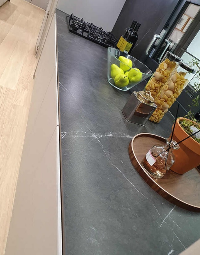Metro lineal de encimera de piedra sinterizada o también llamada porcelánica Mod. MOMA PALADIO de 12 mm de grosor, terminación en gris antracita marrón con vetas blancas.